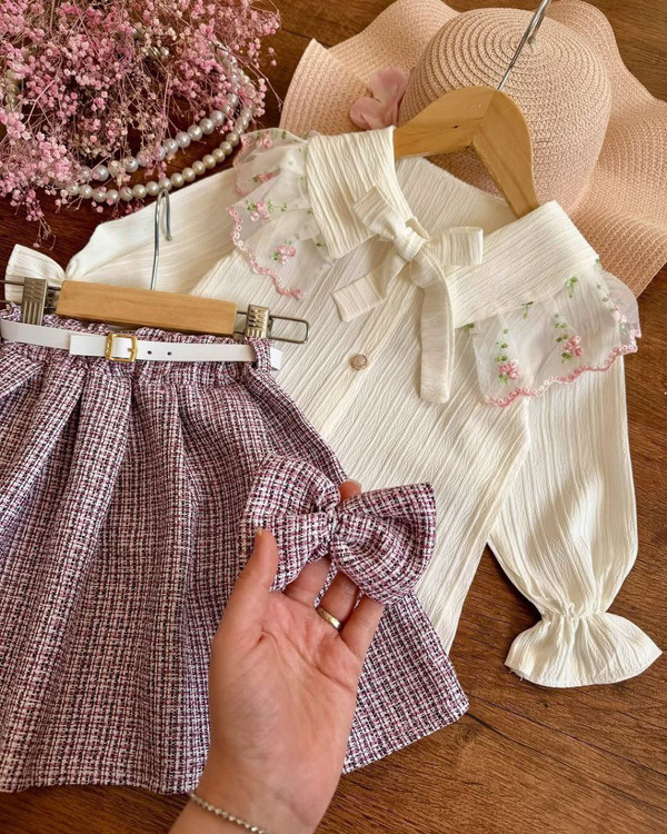 ست شومیز و دامن رز بهمراه کمربند و پاپیون